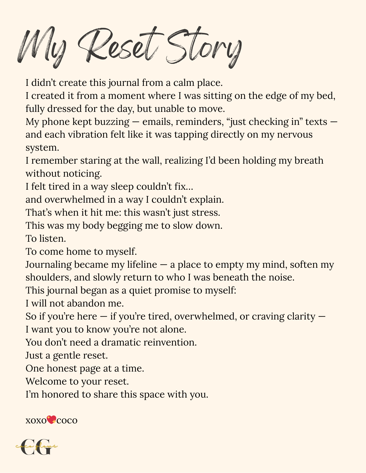 I created The Reset Lab Journal during a season where I felt stretched thin, emotionally drained, and disconnected from myself. Journaling became my way back home â one honest page, one breath, one tiny moment of stillness at a time.